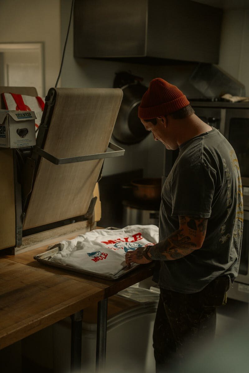 Ready to press transfers are revolutionizing the custom apparel industry, making personalization quicker and more accessible. With a vast array of designs and the convenience of heat application, businesses and DIY enthusiasts alike can create stunning, customized pieces in a fraction of the time traditional methods would take.Man working on custom T-shirt printing in a dimly lit workshop.